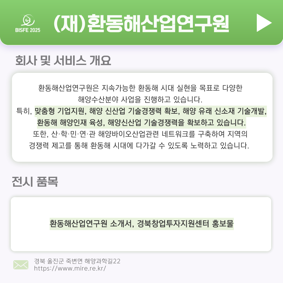 2025 참가업체 환동해산업연구원 페이지 정보 본문 2025 부산국제수산EXPO 참가업체 환동해산업연구원 입니다. 목록 이전글강릉과학산업진흥원 25.11.05 다음글충남테크노파크 25.11.05