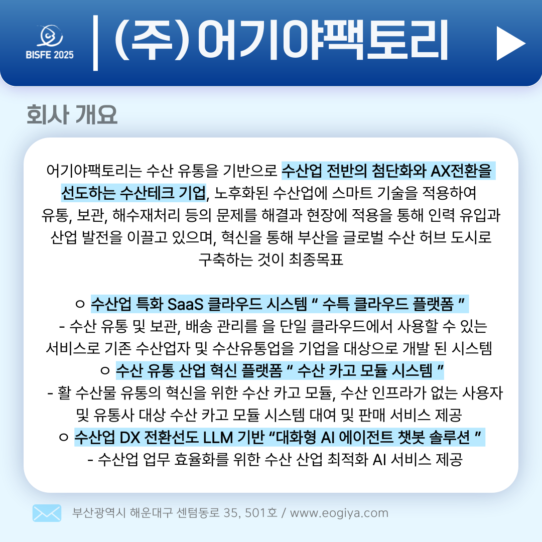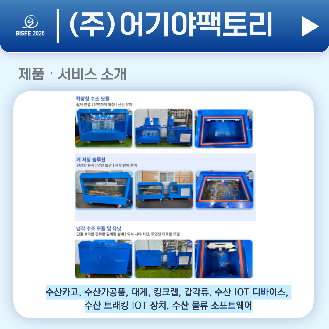 2025 참가업체 (주)어기야팩토리 페이지 정보 본문 2025 부산국제수산EXPO 참가업체 (주)어기야팩토리입니다. 목록 이전글(주)그랜드벨 25.10.23 다음글(주)더소스코리아 25.10.23