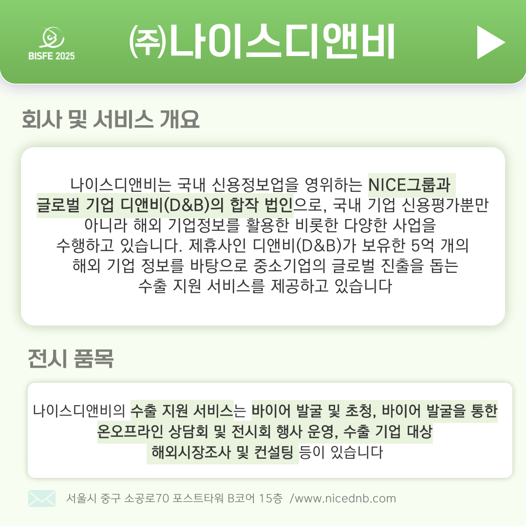 2025 참가업체 (주)나이스디앤비 페이지 정보 본문 2025 부산국제수산EXPO 참가업체 (주)나이스디앤비 입니다. 목록 이전글한국방사선진흥협회 25.10.15 다음글(사)한국수산회 25.10.15
