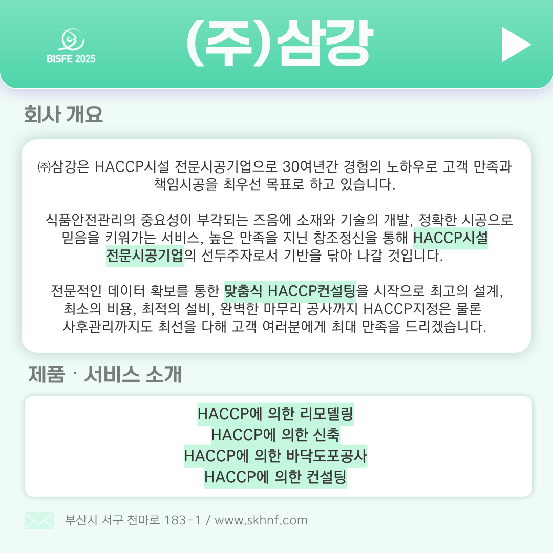 2025 참가업체 (주)삼강종합건설 페이지 정보 본문 2025 부산국제수산EXPO 참가업체 (주)삼강종합건설 입니다. 목록 이전글노쉬프로젝트 25.09.22 다음글주식회사 비엔티 25.09.19