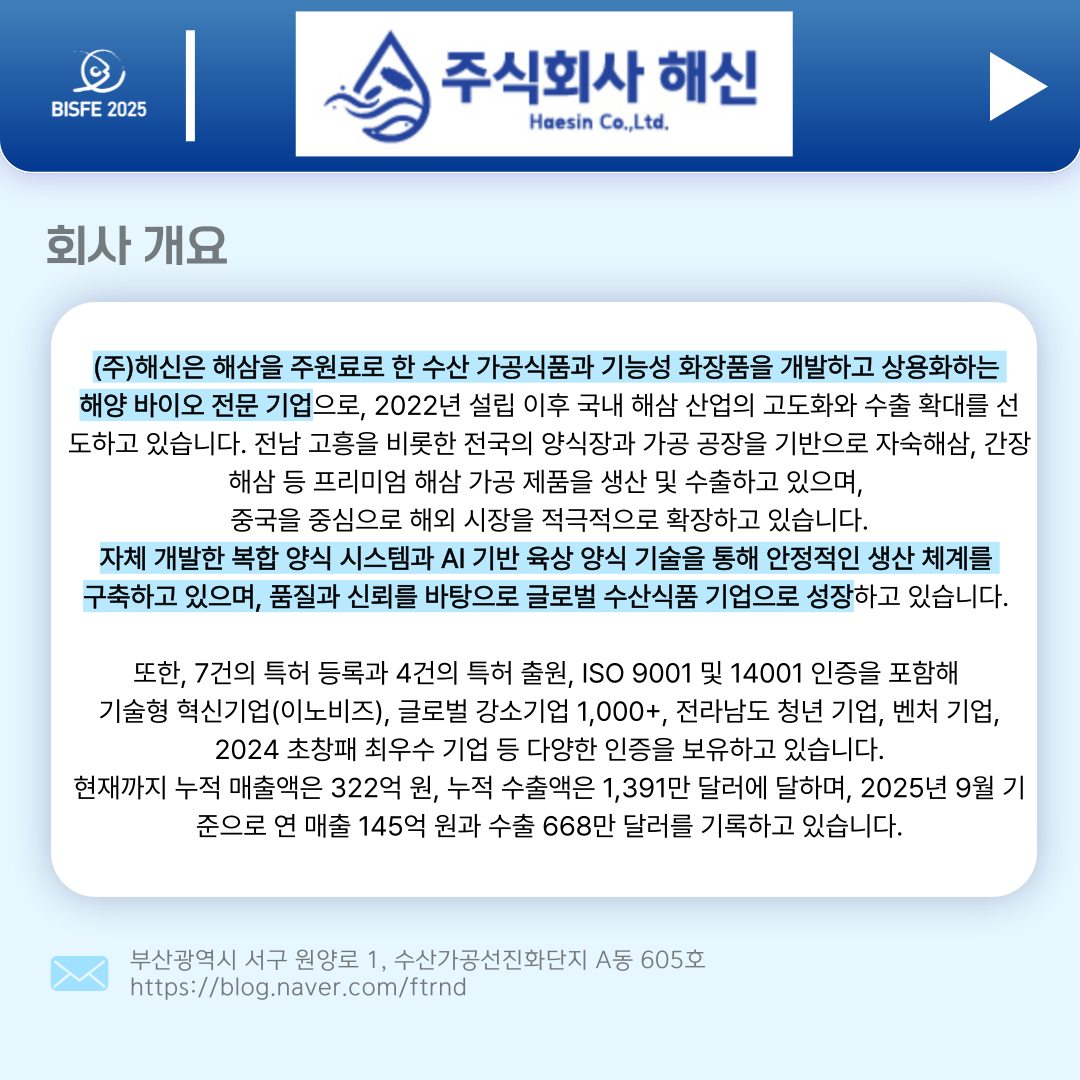 2025 참가업체 (주)해신 페이지 정보 본문 2025 부산국제수산EXPO 참가업체 (주)해신 입니다. 검색 목록 이전글알리바바닷컴 코리아 25.10.28 다음글INDUSTRIAL PLANKTON 25.10.28