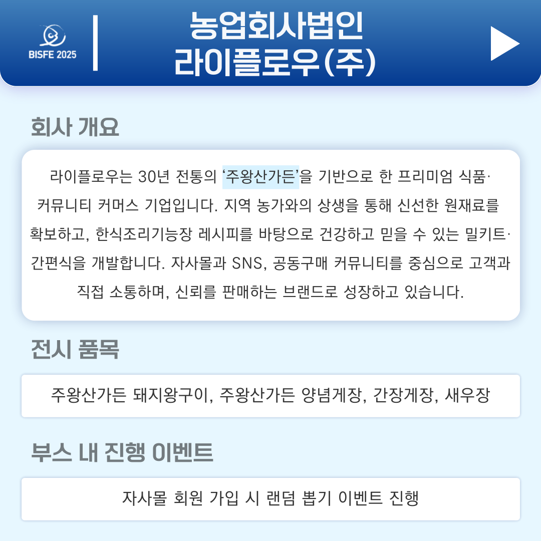 2025 참가업체 라이플로우 페이지 정보 본문 2025 부산국제수산EXPO 참가업체 라이플로우 입니다. 검색 목록 이전글(주)성우에프앤비 25.11.05 다음글(주)목포센터 25.11.05