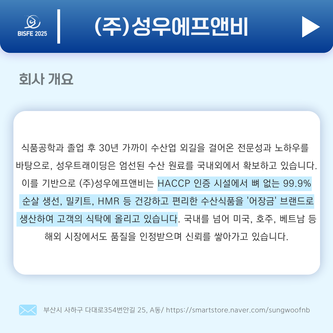 2025 참가업체 (주)성우에프앤비 페이지 정보 본문 2025 부산국제수산EXPO 참가업체 (주)성우에프앤비 입니다. 검색 목록 이전글한국해양대 해양경제연구센터 25.11.05 다음글라이플로우 25.11.05