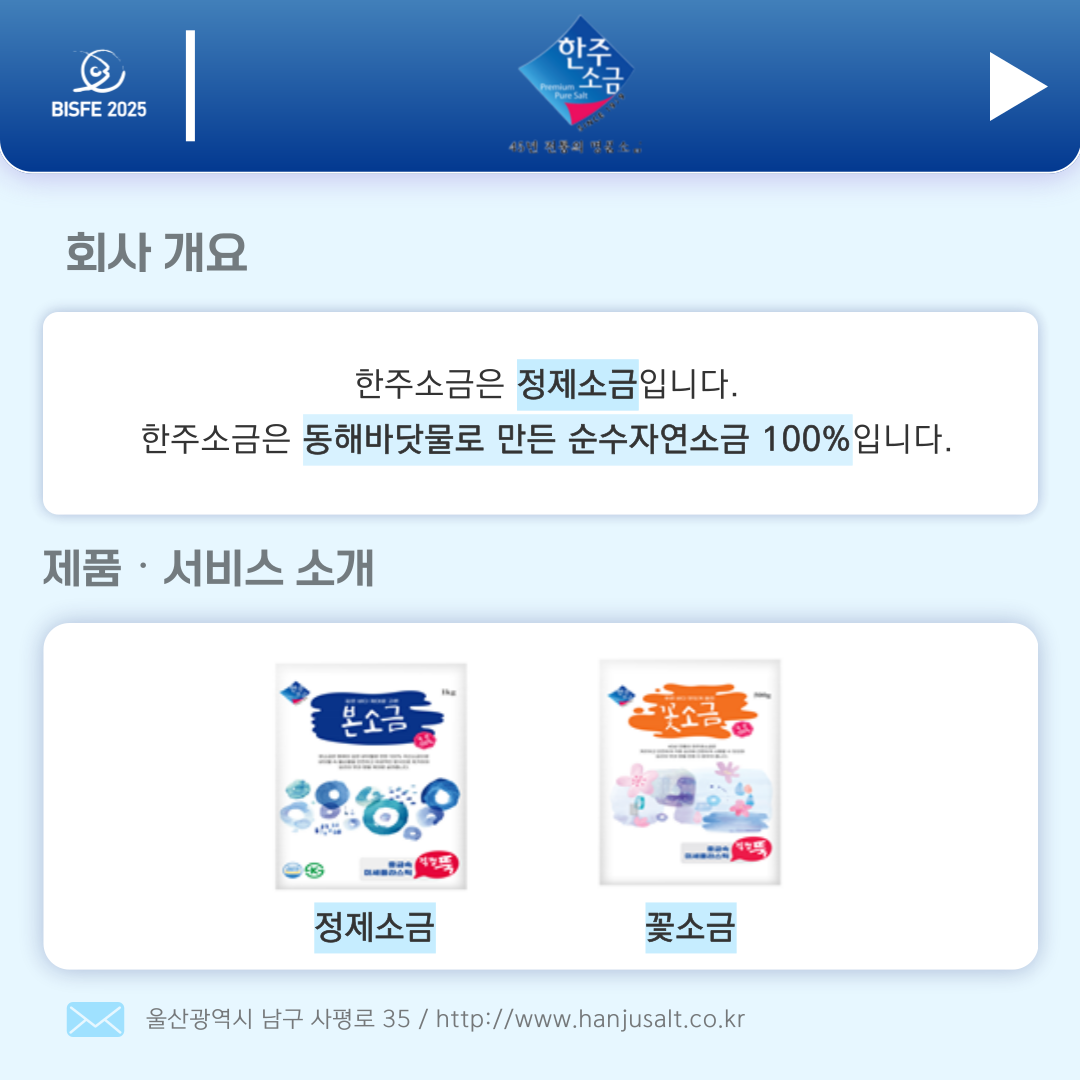 2025 참가업체 주식회사 한주 페이지 정보 본문 2025 부산국제수산EXPO 참가업체 주식회사 한주입니다. 목록 이전글주식회사 비엔티 25.09.19 다음글서천한산식품 25.09.19