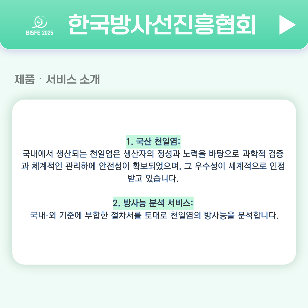2025 참가업체 한국방사선진흥협회 페이지 정보 본문 2025 부산국제수산EXPO 참가업체 한국방사선진흥협회 입니다. 목록 이전글(주)해가인 25.10.15 다음글(주)나이스디앤비 25.10.15