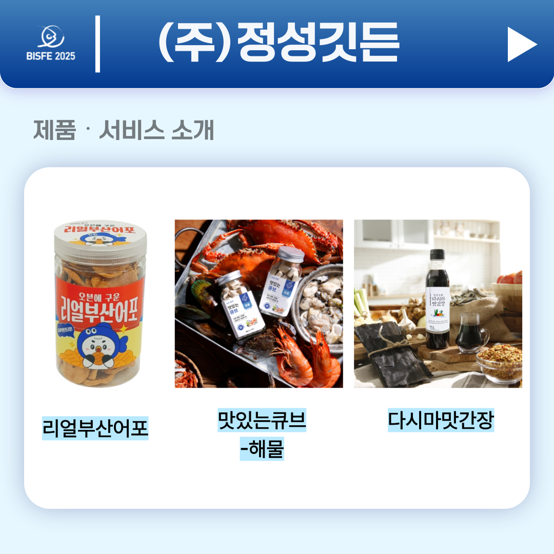2025 참가업체 (주)정성깃든 페이지 정보 본문 2025 부산국제수산EXPO 참가업체 (주)정성깃든 입니다. 목록 이전글농업회사법인 주식회사 애농 25.10.15 다음글명성식품 25.10.15