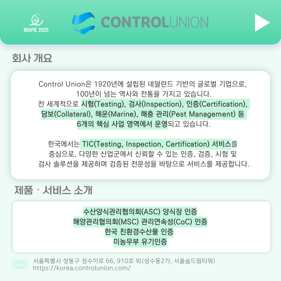 2025 참가업체 컨트롤유니온코리아 페이지 정보 본문 2025 부산국제수산EXPO 참가업체 컨트롤유니온코리아 입니다. 목록 이전글풍미어장 25.10.16 다음글한국아시아산업유한회사 25.10.15