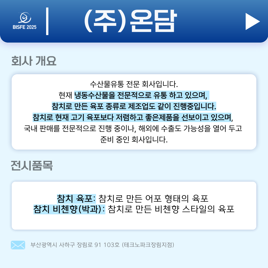 2025 참가업체 주식회사 온담 페이지 정보 본문 2025 부산국제수산EXPO 참가업체 주식회사 온담입니다. 목록 이전글대한상사중재원 25.10.27 다음글재원글로벌넷 25.10.27