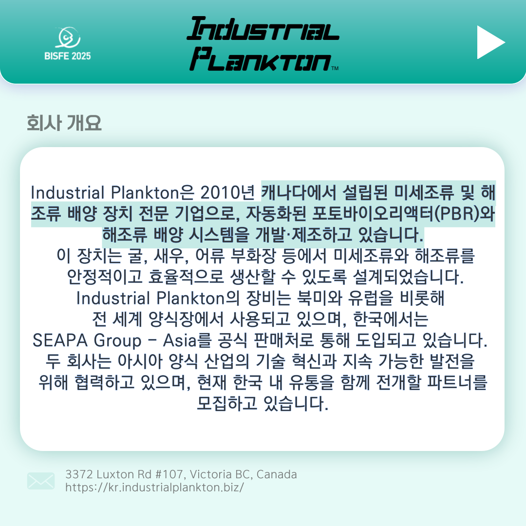 2025 참가업체 INDUSTRIAL PLANKTON 페이지 정보 본문 2025 부산국제수산EXPO 참가업체 INDUSTRIAL PLANKTON 입니다. 목록 이전글(주)해신 25.10.28 다음글SEAPA 25.10.28