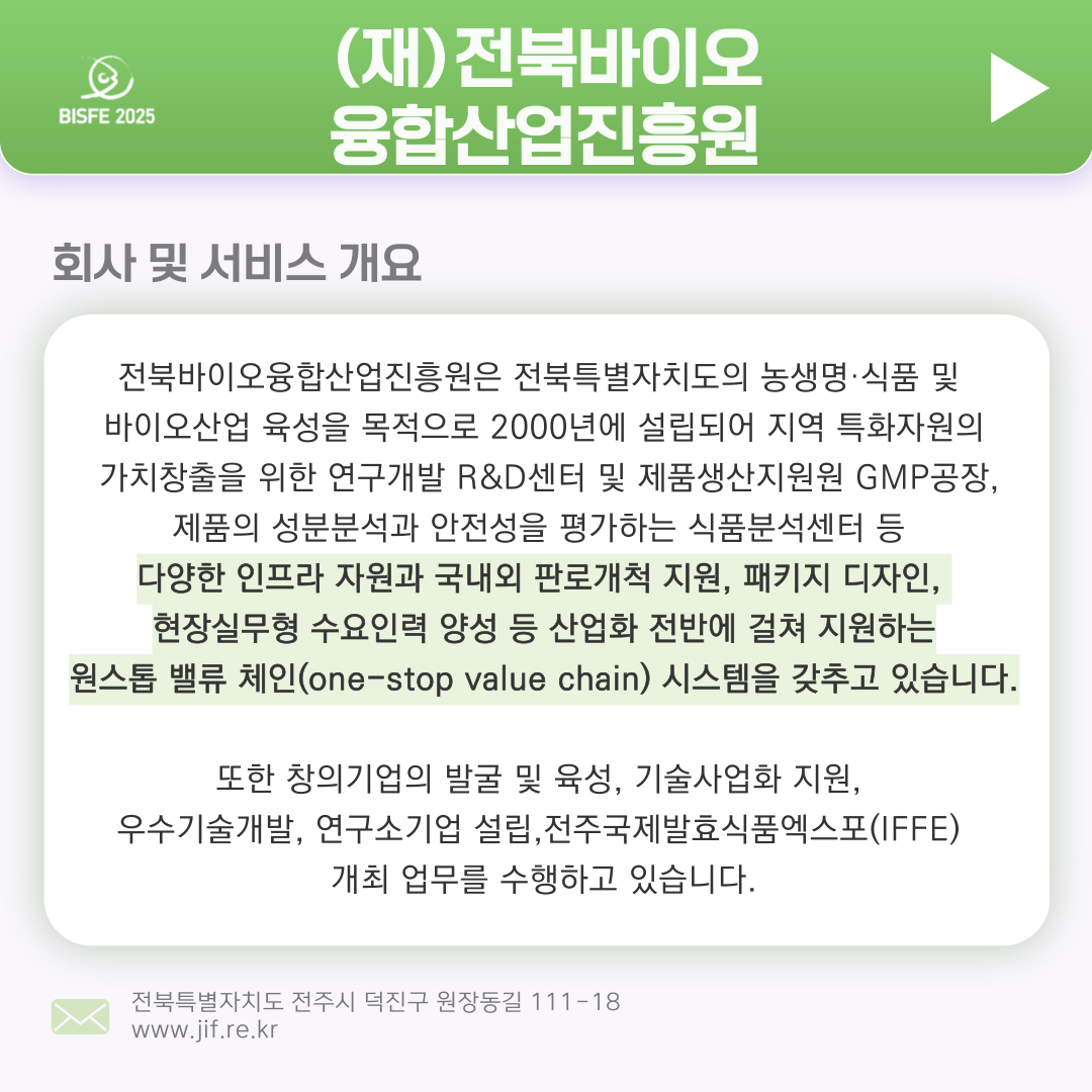 2025 참가업체 전북바이오융합산업진흥원 페이지 정보 본문 2025 부산국제수산EXPO 참가업체 전북바이오융합진흥원 입니다. 목록 이전글제주테크노파크 25.11.05 다음글사단법인 부산수산정책포럼 25.11.05