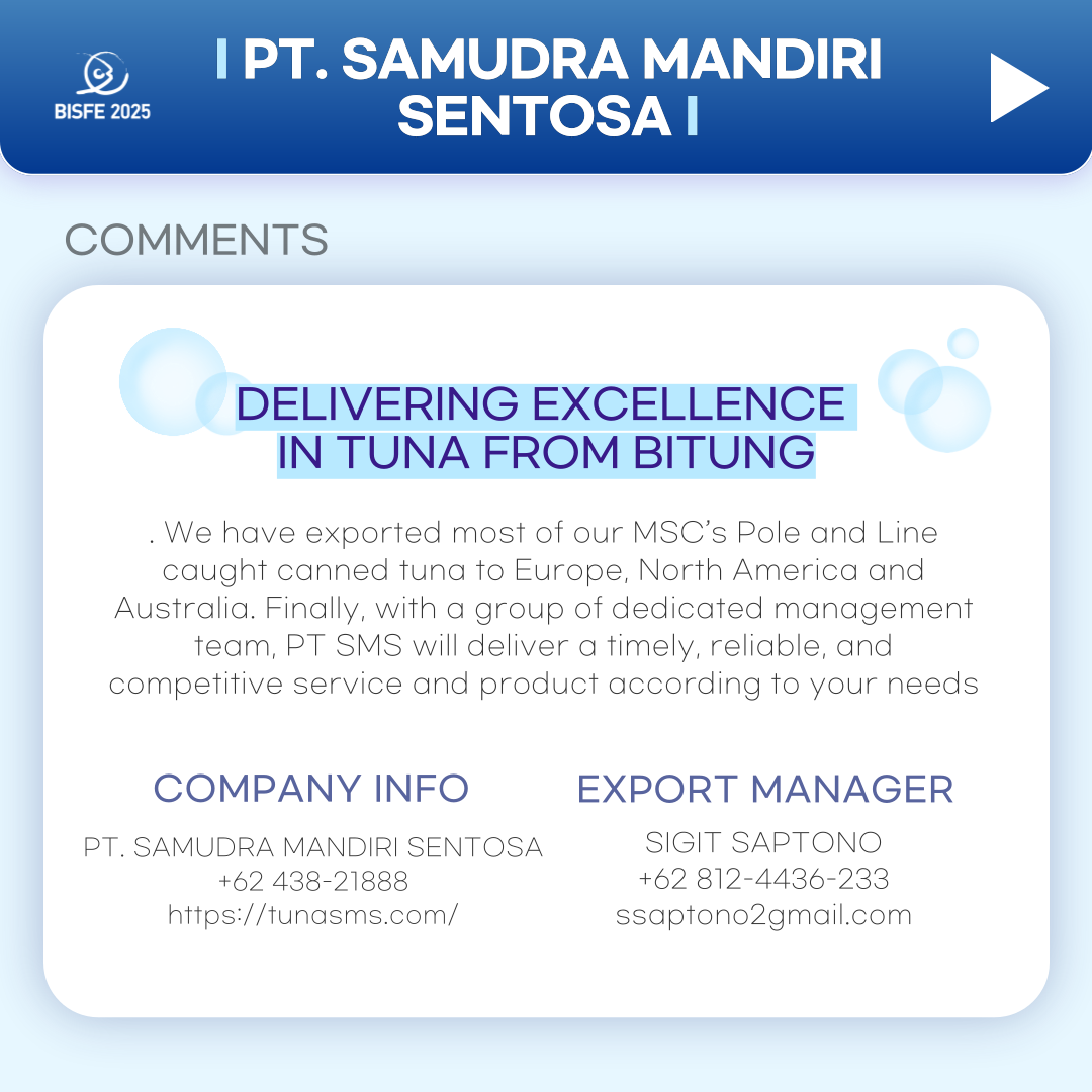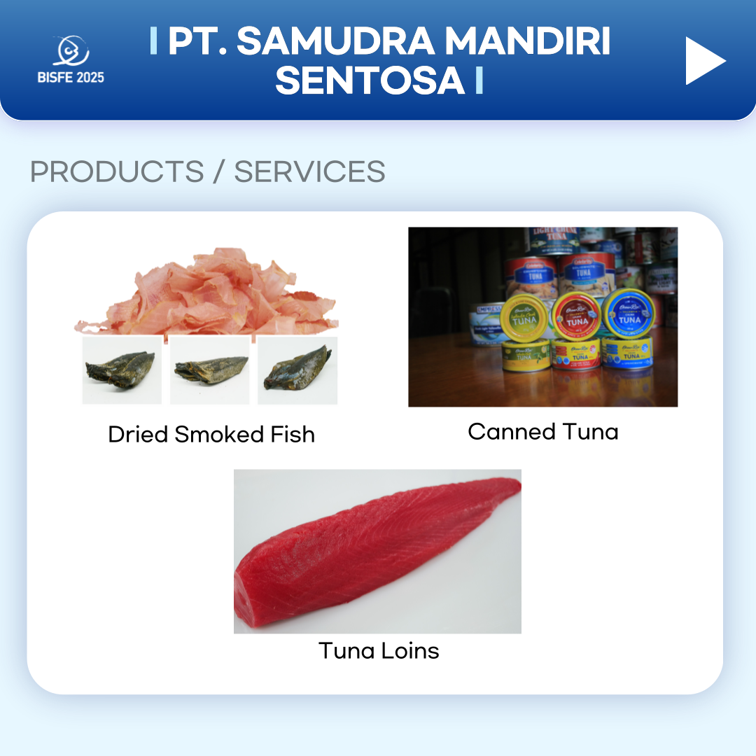 Meet their Dried Smoked Fish, Canned Tuna, Retortable Pouch Tuna, Frozen Pre-Cooked Tuna Loins, Fish Meal and Frozen Yellowfin Tuna Loins in #BISFE2025.