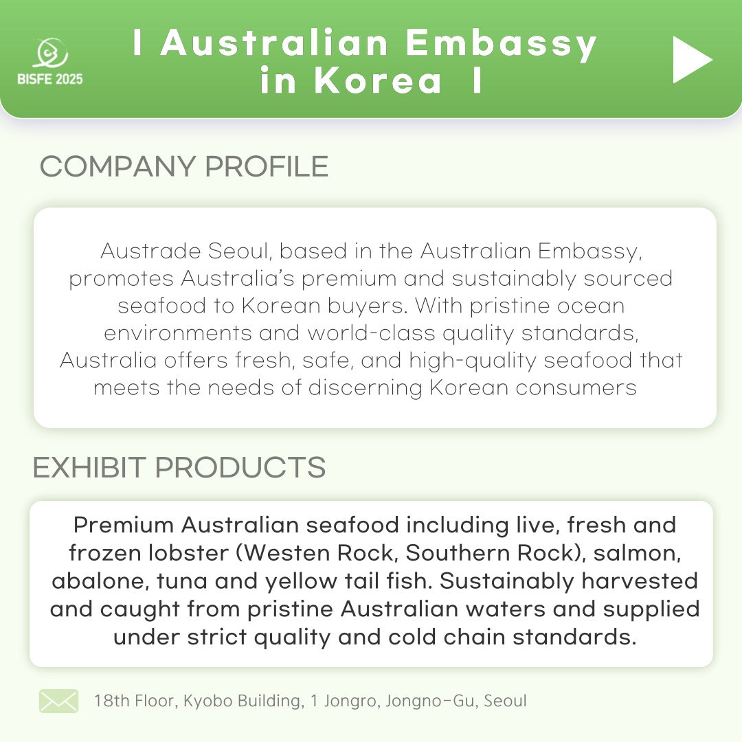 2025 Australian Embassy in Korea 본문 Introducing our exhibitor "Australian Embassy in Korea"Meet their Premium Australian seafood in #BISFE2025.호주대사관을 소개합니다.부산국제수산 EXPO에서 고급 호주 해산물 전시를 만나보세요.#AustralianEmbassyinKorea #BISFE2025 검색 List NextPT. IAMBEU MINA UTAMA 25.10.27
