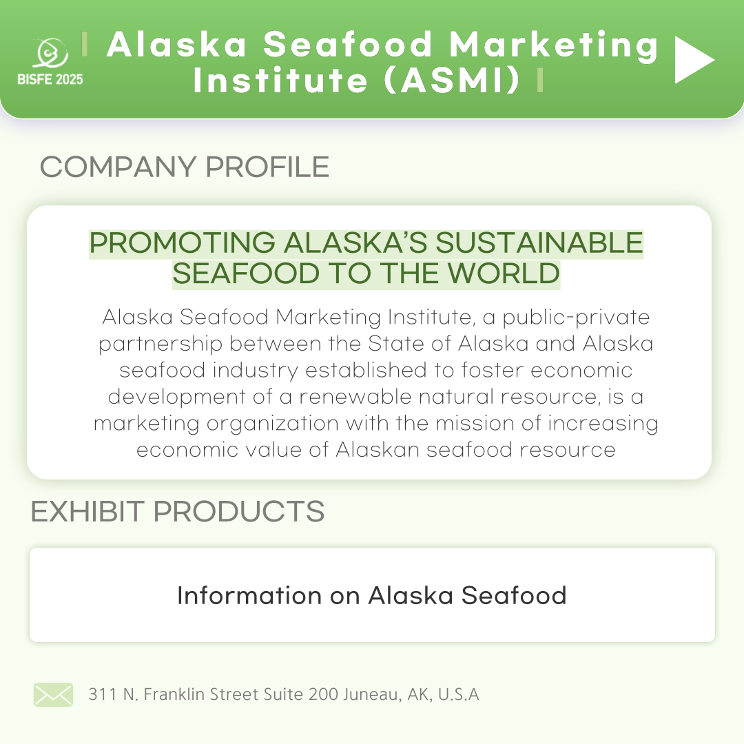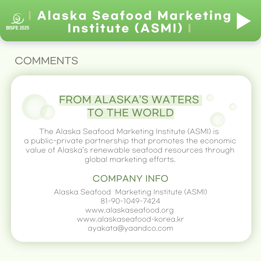 2025 Alaska Seafood Marketing Institute (ASMI) 본문 Introducing our exhibitor "Alaska Seafood Marketing Institute (ASMI)" !Meet Alaska Seafood Marketing Institute (ASMI) in #BISFE2025.Alaska Seafood Marketing Institute (ASMI)을 소개합니다.부산국제수산 EXPO에서 만나보세요.#AlaskaSeafoodMarketingInstitute #ASMI #bisfe2025 List PrevFood Export USA - Northeast 25.10.13 NextSea Salt, LCC 25.10.13