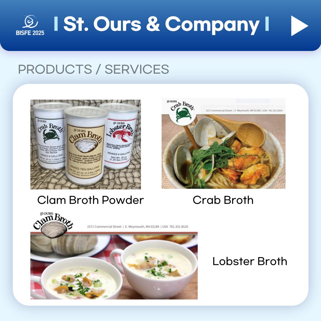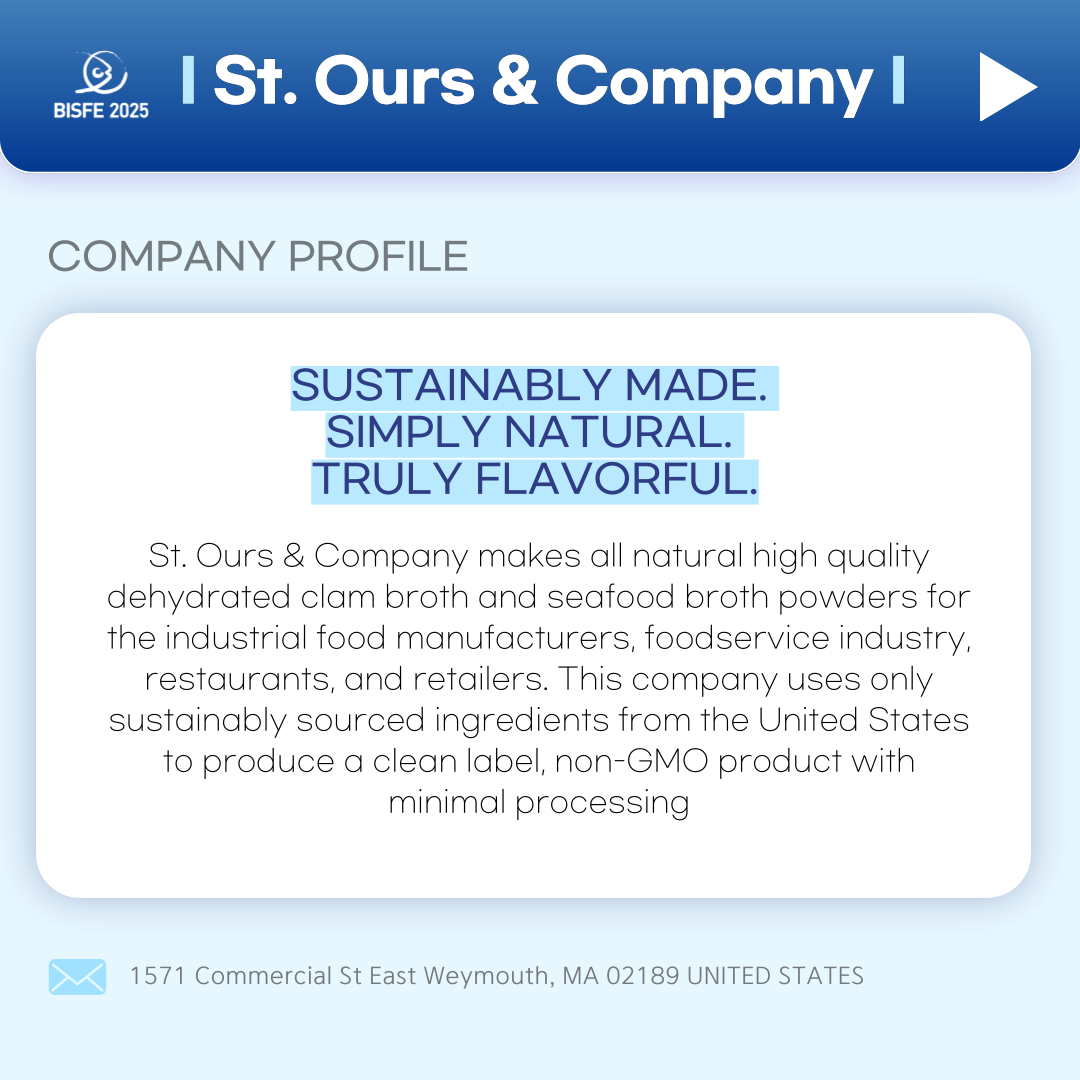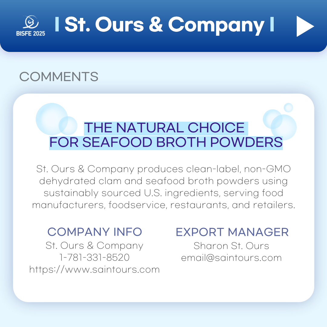 2025 St. Ours&Company 본문 Introducing our exhibitor "St. Ours&Company" from USA!Meet their Clam Broth Powder, Crab Broth and Lobster Broth in #BISFE2025.미국에서 온 St. Ours&Company 를 소개합니다.부산국제수산 EXPO에서 조개육수분말, 꽃게육수, 랍스터 육수를 만나보세요.#StOursandCompany #BISFE2025 List PrevDONGGANG DONGFU FOOD CO.,LTD 25.10.16 NextFood Export USA - Northeast 25.10.13