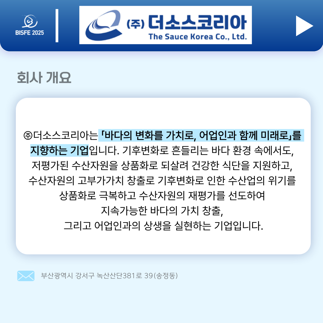 2025 참가업체 (주)더소스코리아 페이지 정보 본문 2025 부산국제수산EXPO 참가업체 (주)더소스코리아입니다. 검색 목록 이전글과자나라 25.10.23 다음글태양수산 25.10.23