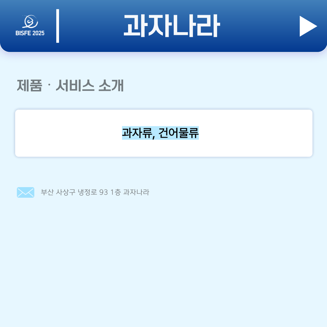 2025 참가업체 과자나라 페이지 정보 본문 2025 부산국제수산EXPO 참가업체 과자나라입니다. 검색 목록 이전글(주)어기야팩토리 25.10.23 다음글(주)더소스코리아 25.10.23
