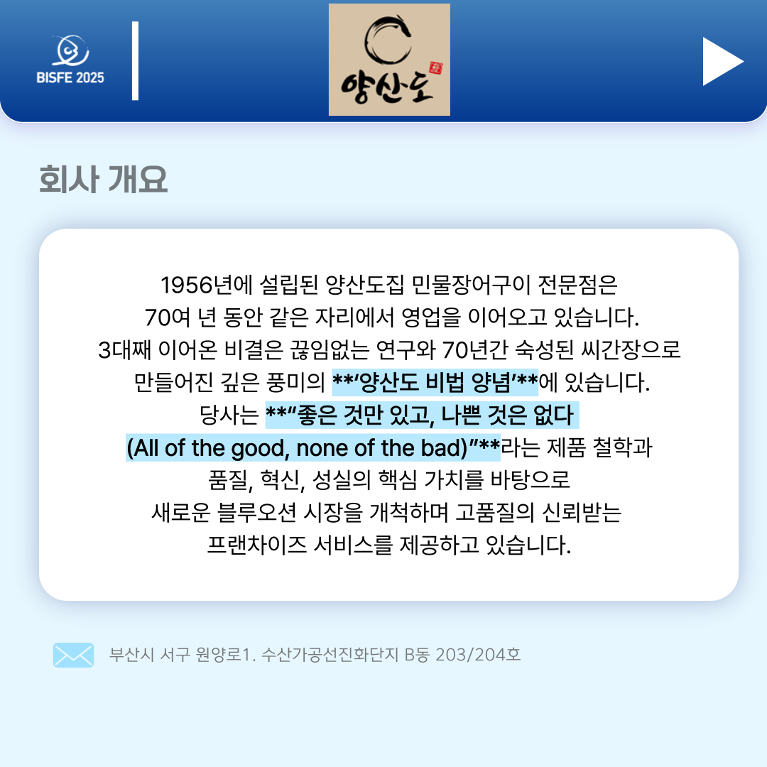 2025 참가업체 (주)양산도에프앤비 페이지 정보 본문 2025 부산국제수산EXPO 참가업체 (주)양산도에프앤비입니다. 검색 목록 이전글고창영어조합법인 25.10.23 다음글바다본 25.10.23