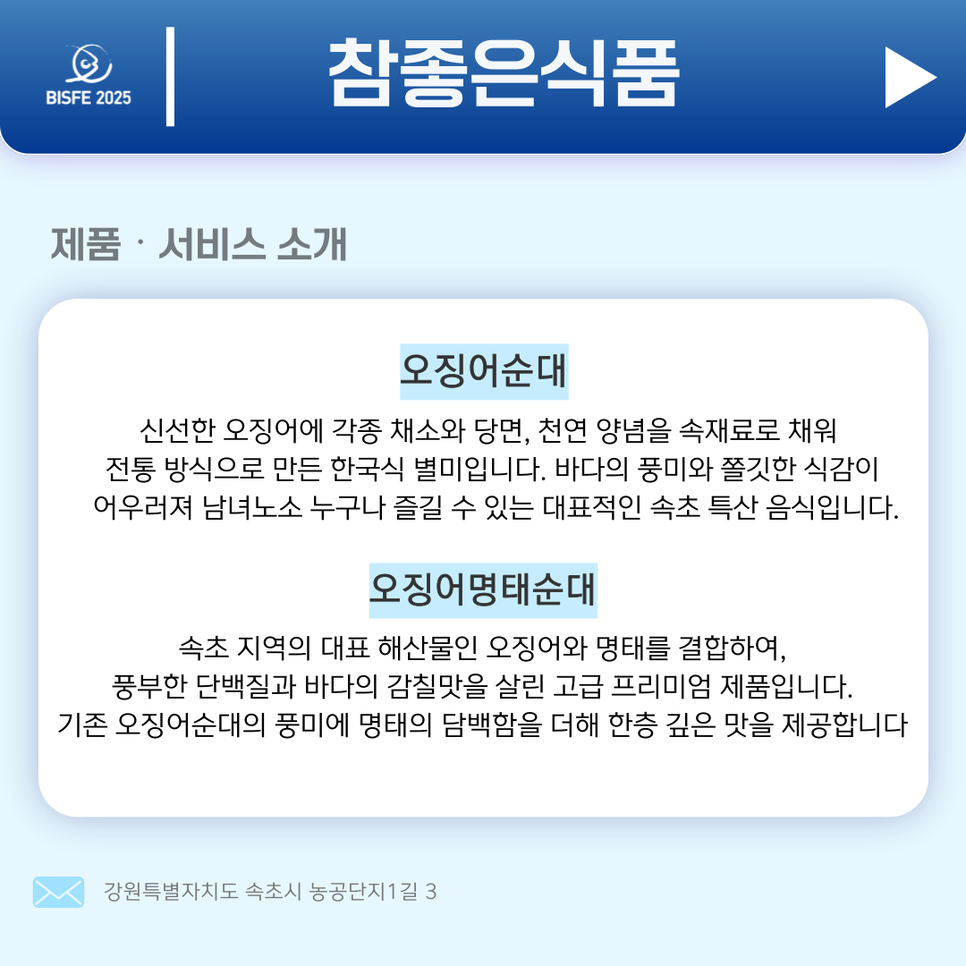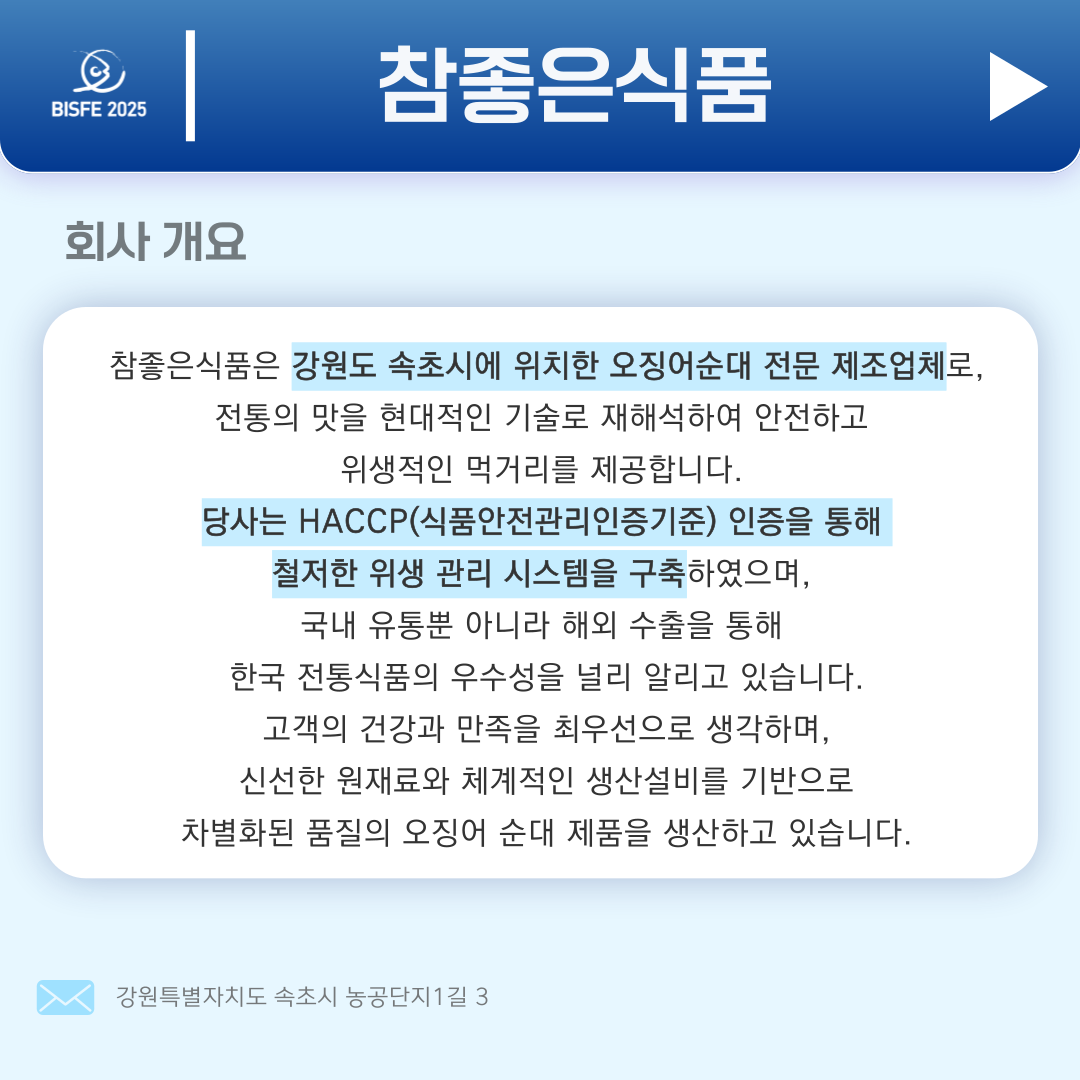 2025 참가업체 참좋은식품 페이지 정보 본문 2025 부산국제수산EXPO 참가업체 참좋은식품 입니다. 목록 이전글완도맘영어조합법인 25.09.18 다음글(주)바다명가 25.09.18