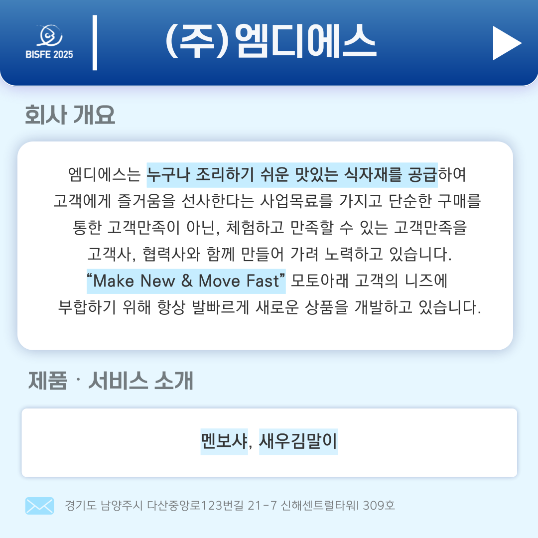 2025 참가업체 주식회사 엠디에스 페이지 정보 본문 2025 부산국제수산EXPO 참가업체 주식회사 엠디에스 입니다. 목록 이전글동해식품상사 25.09.19 다음글완도바다영어조합법인 25.09.18