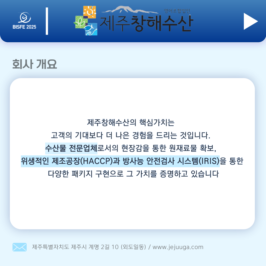2025 참가업체 제주창해수산 페이지 정보 본문 2025 부산국제수산EXPO 참가업체 제주창해수산 입니다. 목록 이전글선호식품 25.09.30 다음글한국지식재산보호원 25.09.26