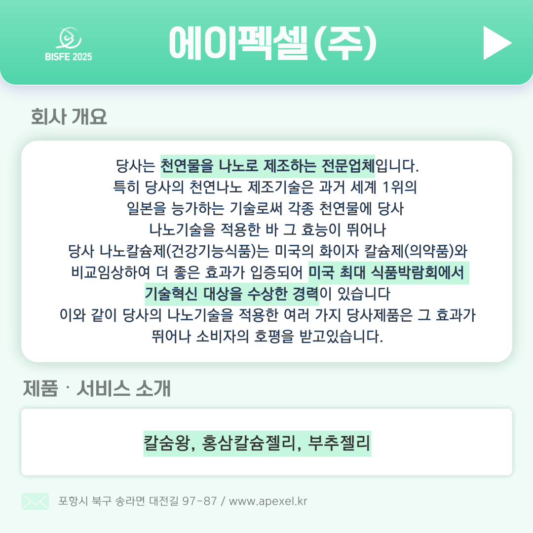 2025 참가업체 에이펙셀(주) 페이지 정보 본문 2025 부산국제수산EXPO 참가업체 에이펙셀(주) 입니다. 목록 이전글다온식품 25.10.15 다음글엔브이씨파트너스(주) 25.10.15