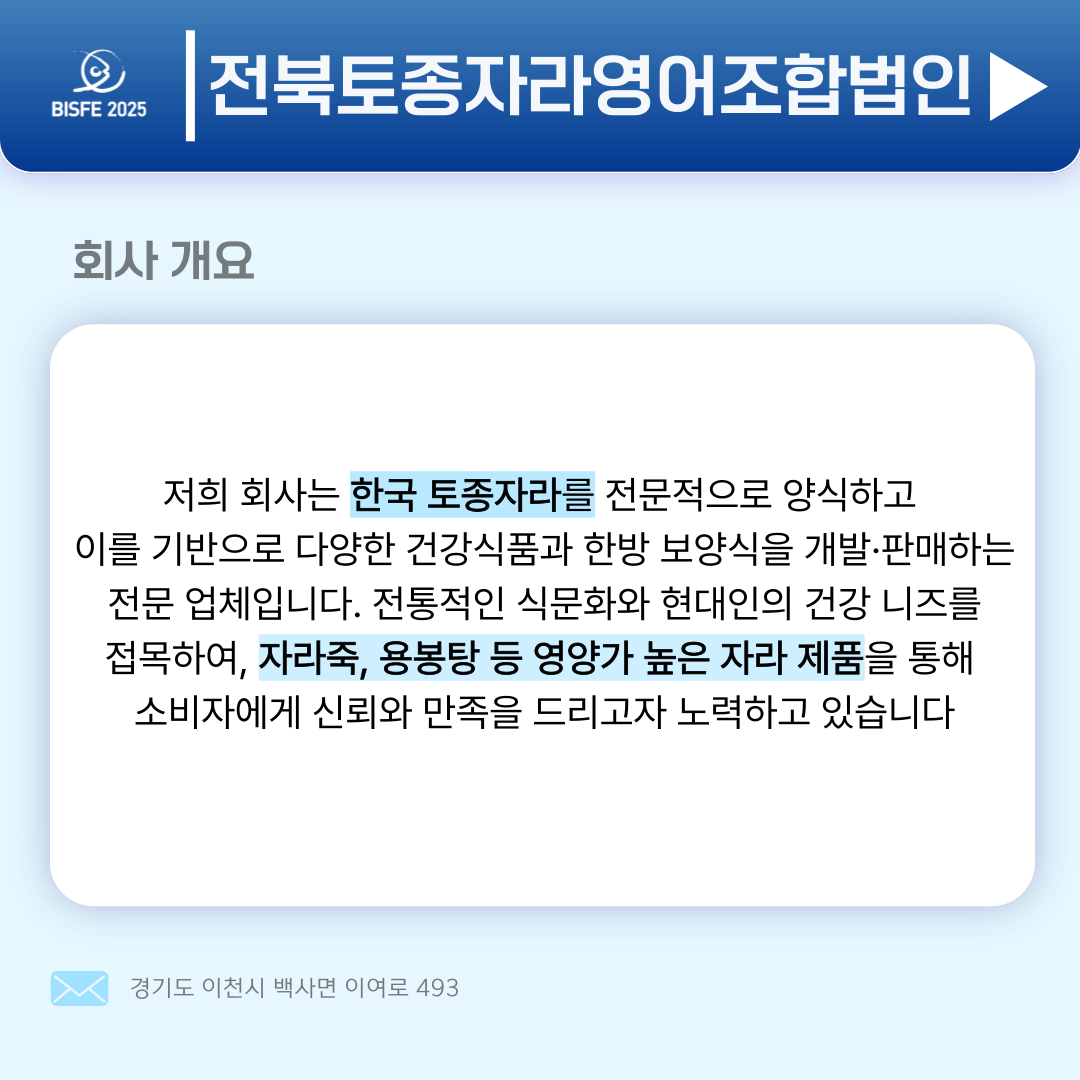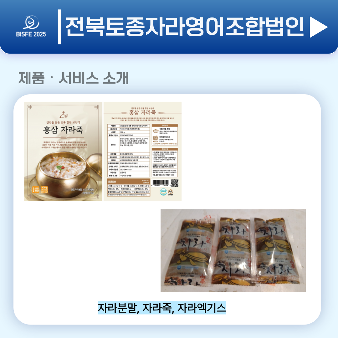 2025 참가업체 전북토종자라영어조합법인 페이지 정보 본문 2025 부산국제수산EXPO 참가업체 전북토종자라영어조합법인 입니다. 목록 이전글어성호 25.10.15 다음글진성식품 25.10.15
