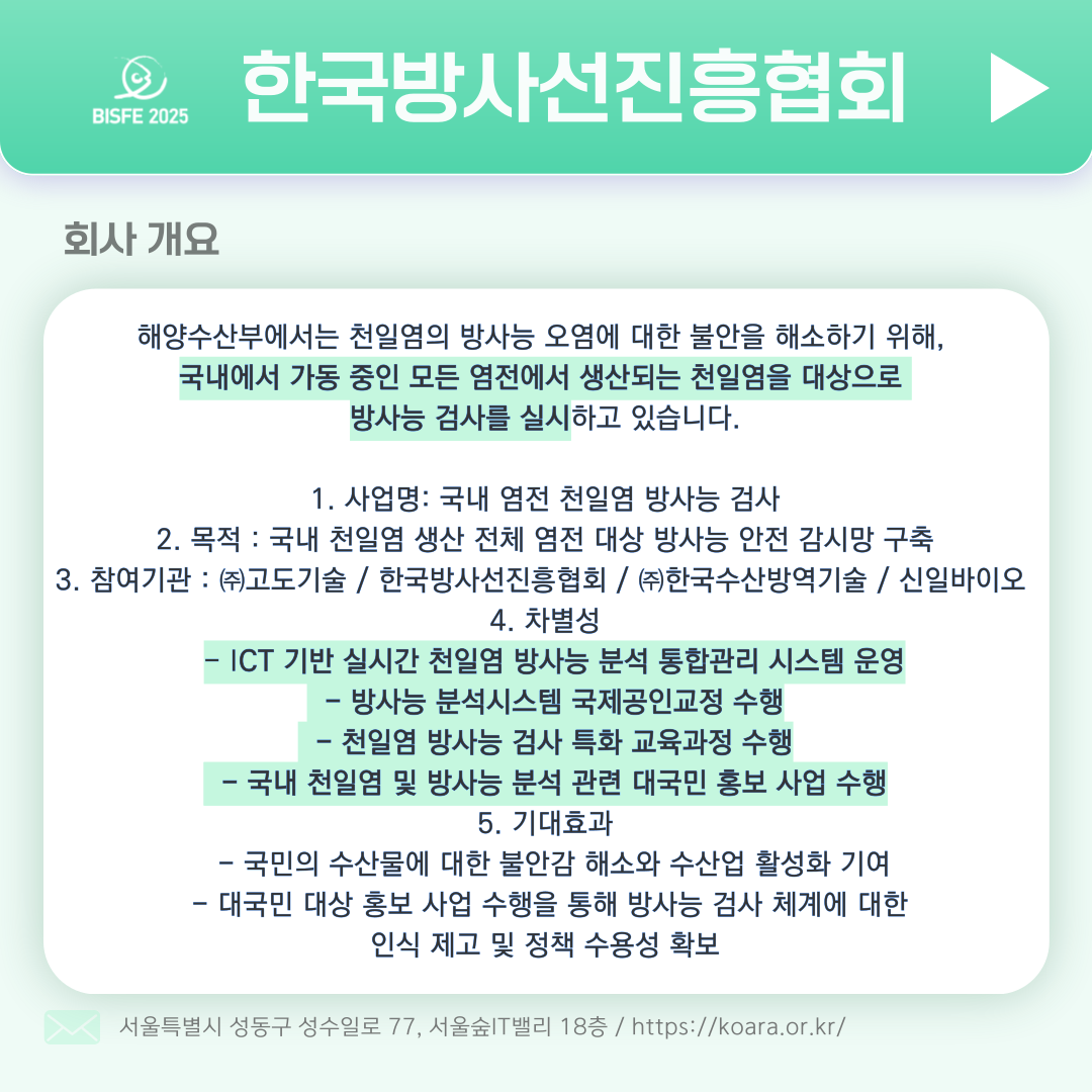 2025 참가업체 한국방사선진흥협회 페이지 정보 본문 2025 부산국제수산EXPO 참가업체 한국방사선진흥협회 입니다. 목록 이전글(주)해가인 25.10.15 다음글(주)나이스디앤비 25.10.15