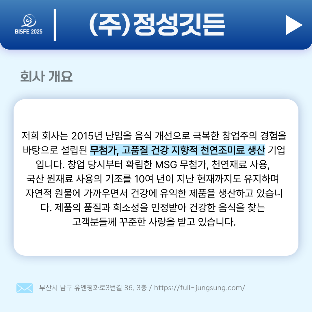 2025 참가업체 (주)정성깃든 페이지 정보 본문 2025 부산국제수산EXPO 참가업체 (주)정성깃든 입니다. 목록 이전글농업회사법인 주식회사 애농 25.10.15 다음글명성식품 25.10.15