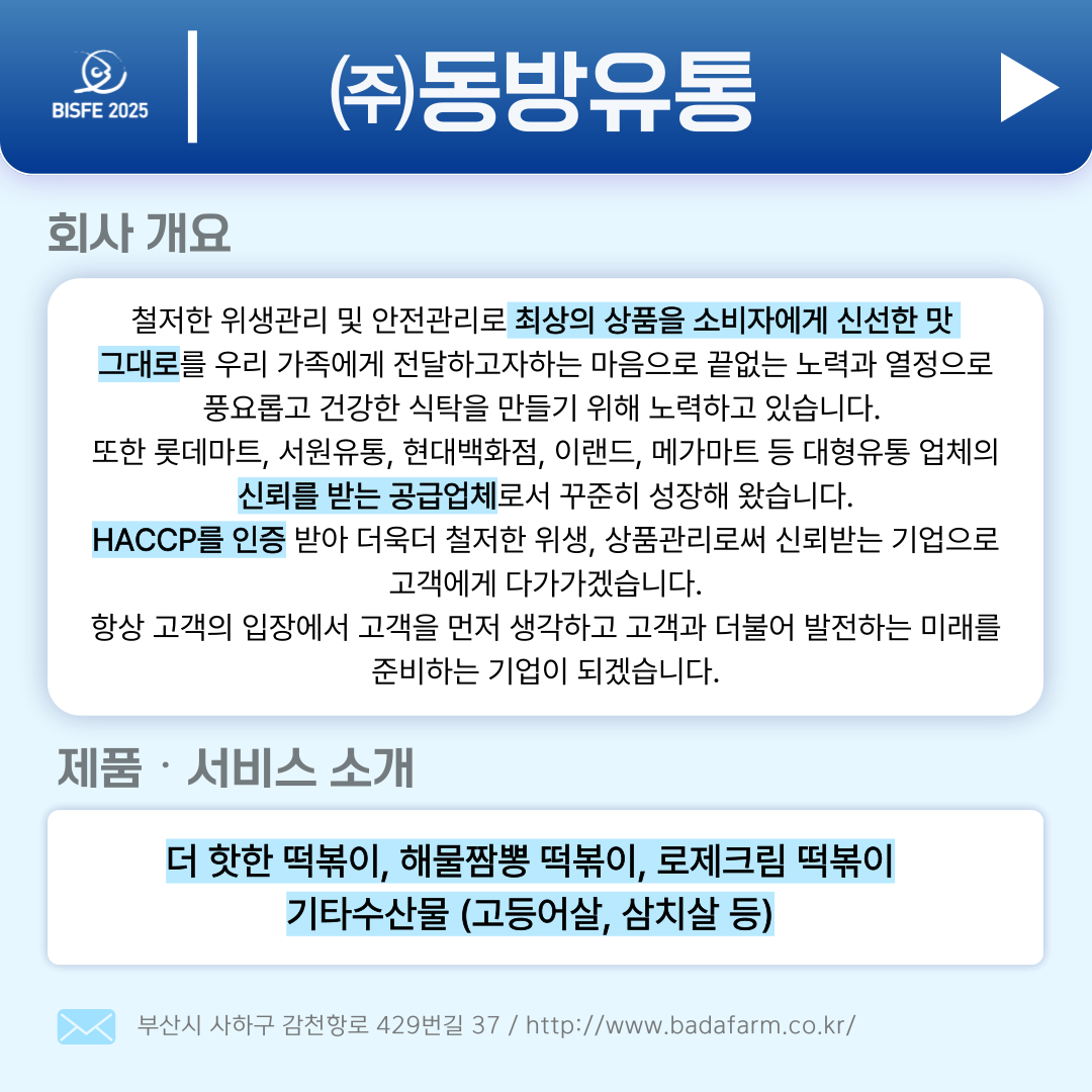 2025 참가업체 (주)동방유통 페이지 정보 본문 2025 부산국제수산EXPO 참가업체 (주)동방유통입니다. 목록 이전글(주)해담 25.10.16 다음글완도전복주식회사 25.10.16