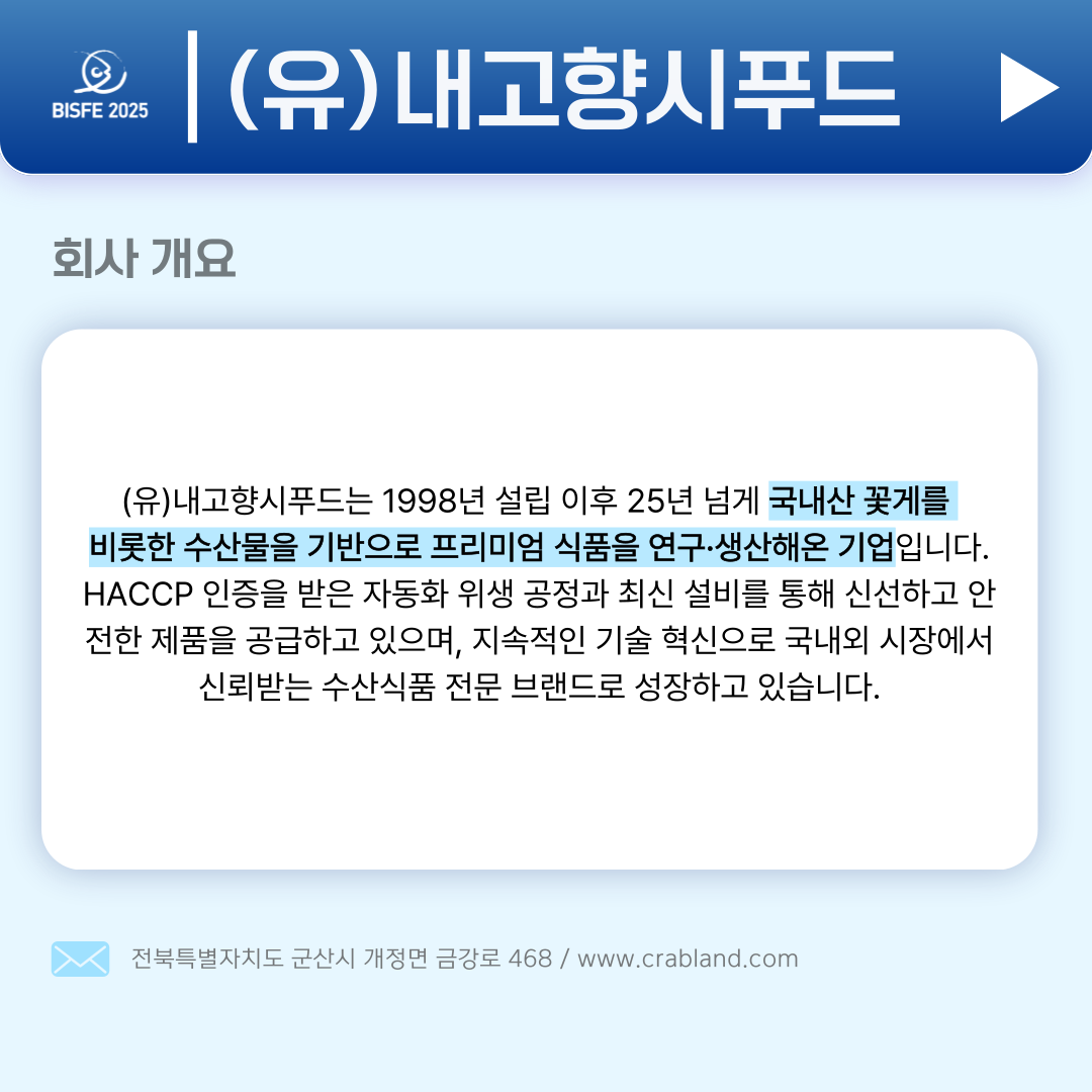 2025 참가업체 내고향시푸드 페이지 정보 본문 2025 부산국제수산EXPO 참가업체 내고향시푸드입니다. 목록 이전글한국지식재산보호원 25.10.20 다음글(주)해담 25.10.16