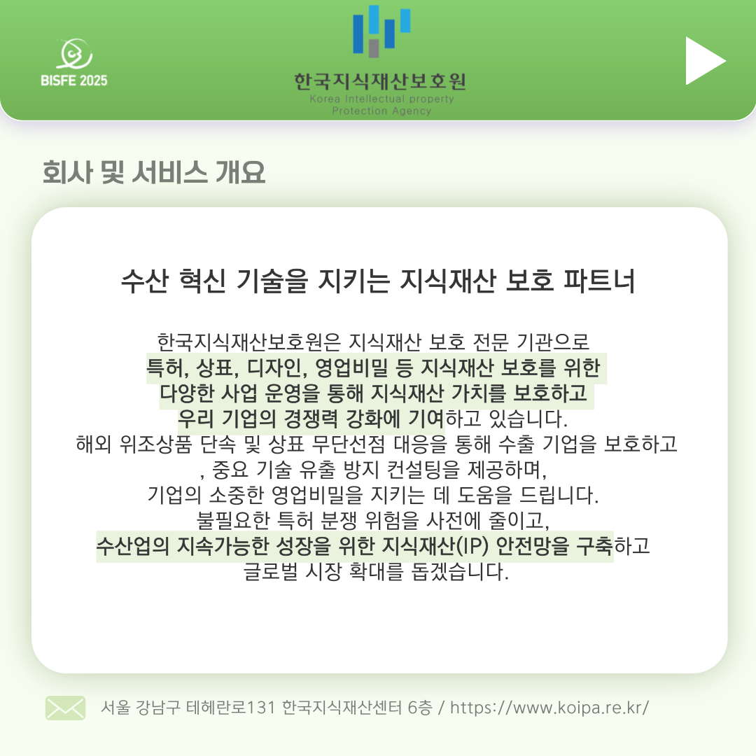 2025 참가업체 한국지식재산보호원 페이지 정보 본문 2025 부산국제수산EXPO 참가업체 한국지식재산보호원 입니다. 목록 이전글지식재산처 25.10.21 다음글내고향시푸드 25.10.16