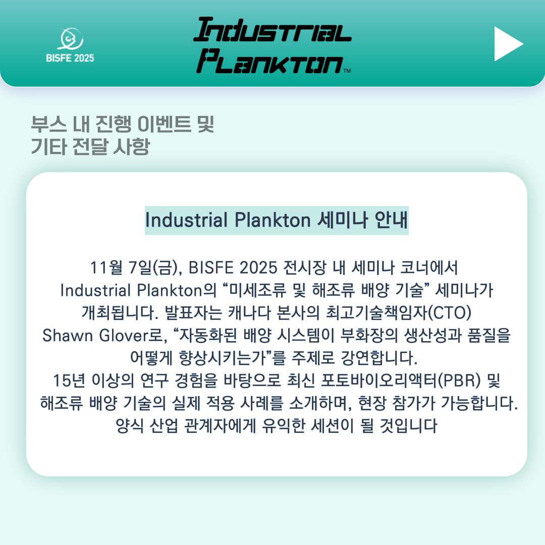 2025 참가업체 INDUSTRIAL PLANKTON 페이지 정보 본문 2025 부산국제수산EXPO 참가업체 INDUSTRIAL PLANKTON 입니다. 목록 이전글(주)해신 25.10.28 다음글SEAPA 25.10.28