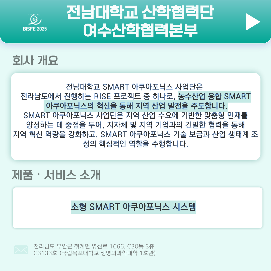 2025 참가업체 전남대학교 산학협력단 여수산학협력본부 페이지 정보 본문 2025 부산국제수산EXPO 참가업체 전남대학교 산학협력단 여수산학협력본부입니다. 목록 이전글(재)목포수산식품 수출센터 25.10.28 다음글(주)큐랩 25.10.28