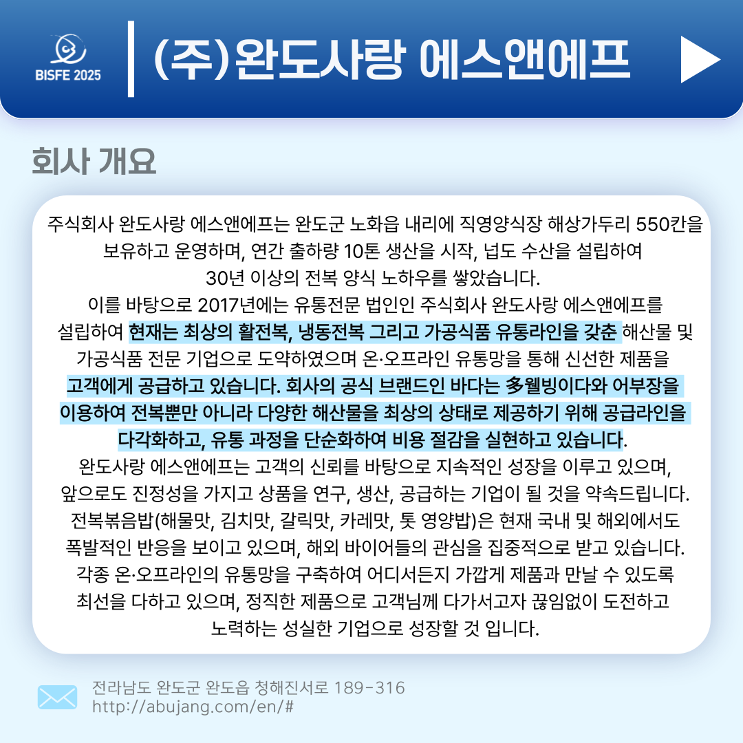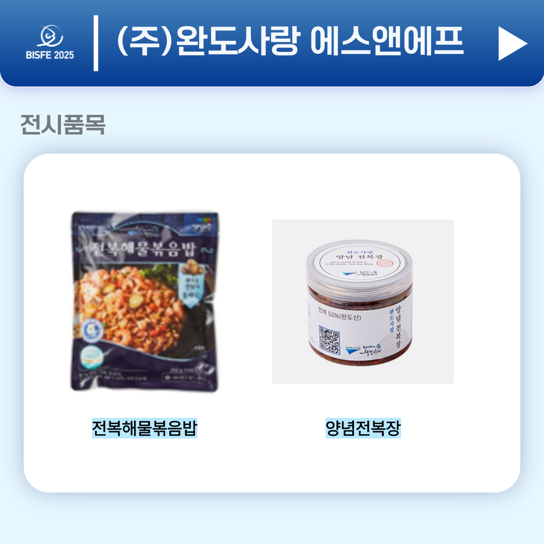 2025 참가업체 (주)완도사랑에스앤에프 페이지 정보 본문 2025 부산국제수산EXPO 참가업체 (주)완도사랑에스앤에프입니다. 목록 이전글(사)명품수산물협회 25.10.29 다음글동해안푸드 25.10.28