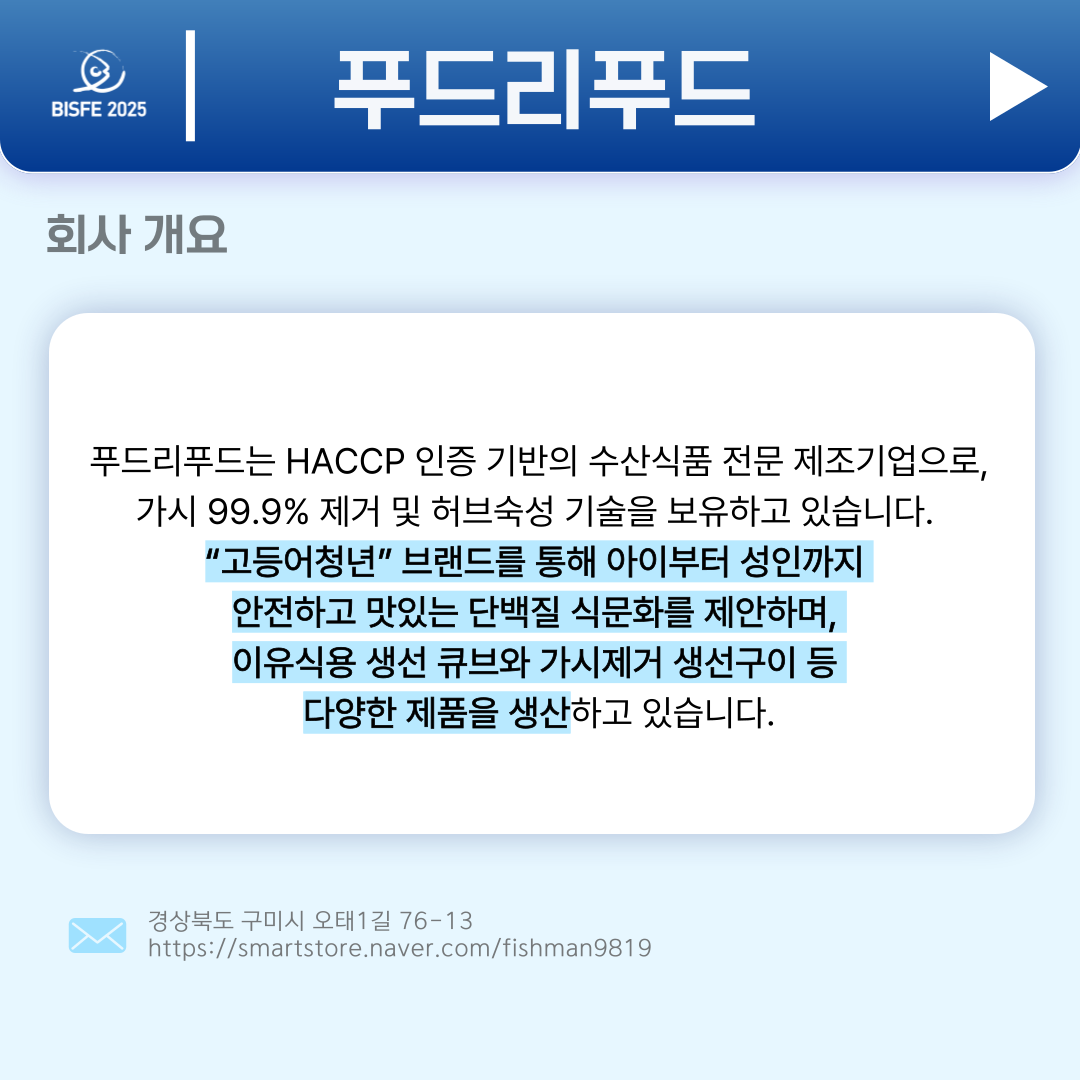 2025 참가업체 푸드리푸드 페이지 정보 본문 2025 부산국제수산EXPO 참가업체 푸드리푸드입니다. 목록 이전글(주)알엠부산그룹 25.10.29 다음글TINGSHENG FOOD (YANTAI) CO.,LTD 25.10.29