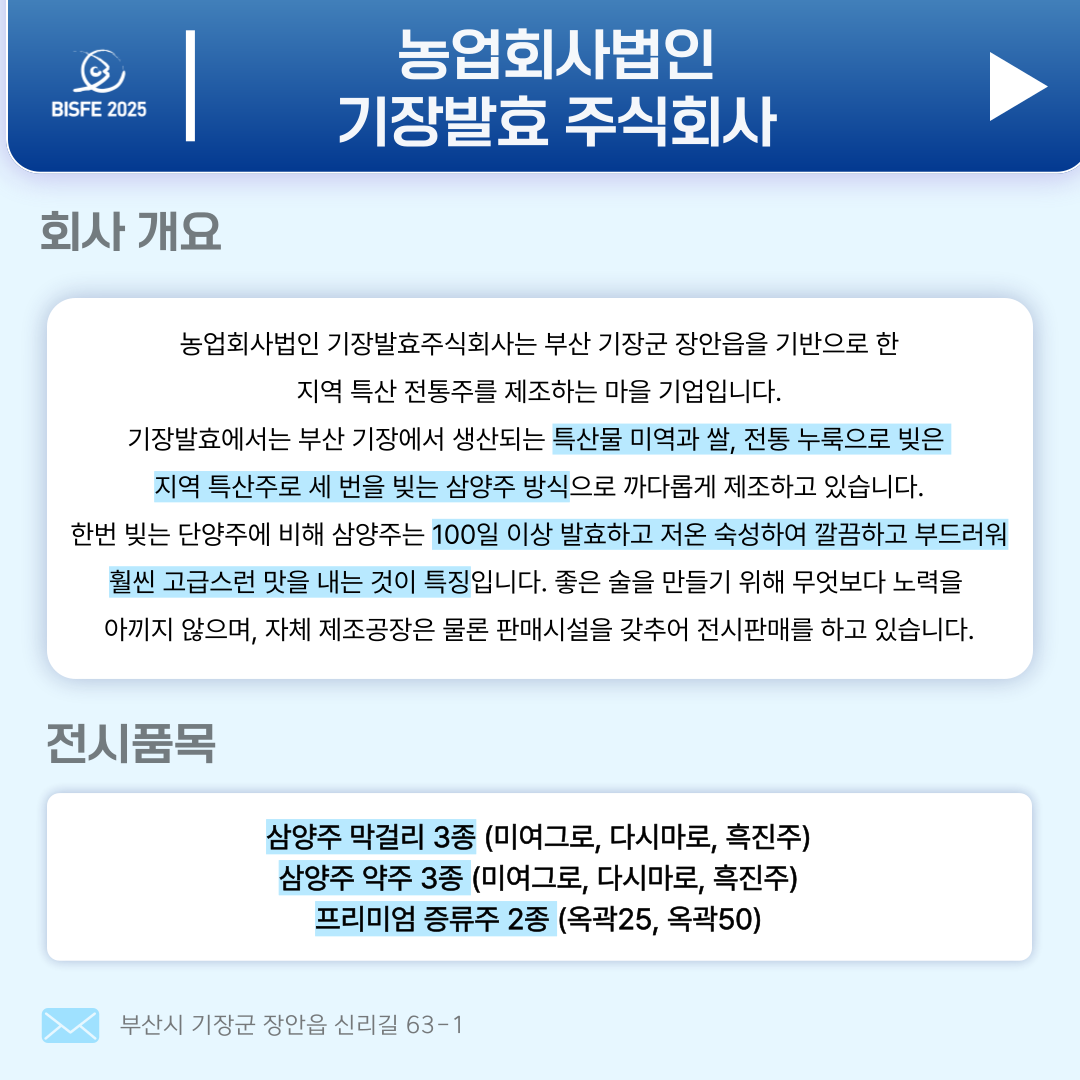 2025 참가업체 농업회사법인 기장발효(주) 페이지 정보 본문 2025 부산국제수산EXPO 참가업체 농업회사법인 기장발효(주) 입니다. 목록 이전글대변어촌장터 25.11.02 다음글기장군청 25.11.02