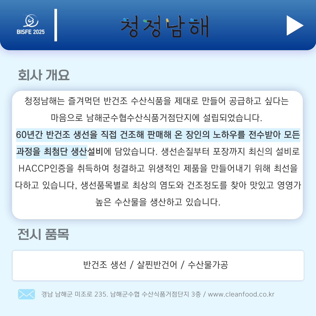2025 부산국제수산EXPO 참가업체 청정남해 입니다.