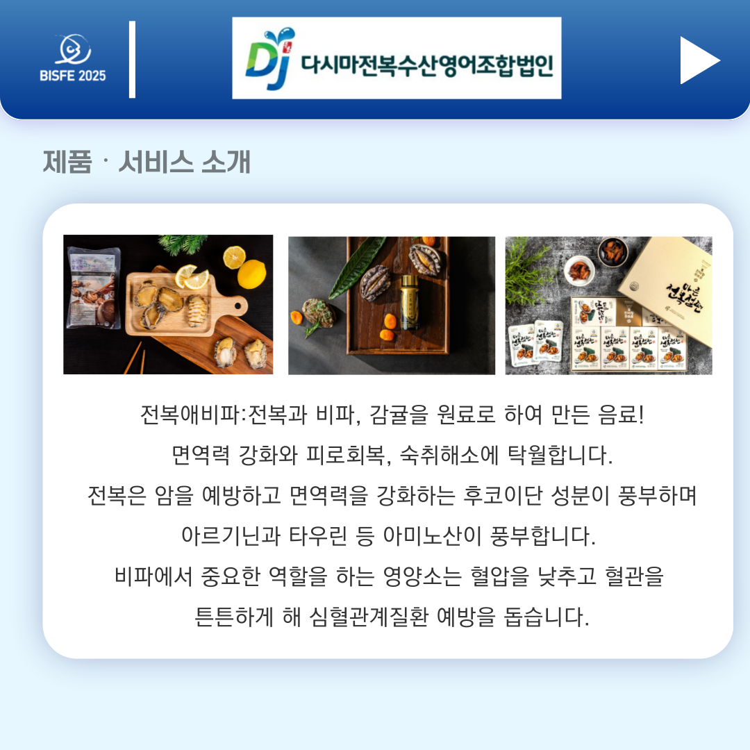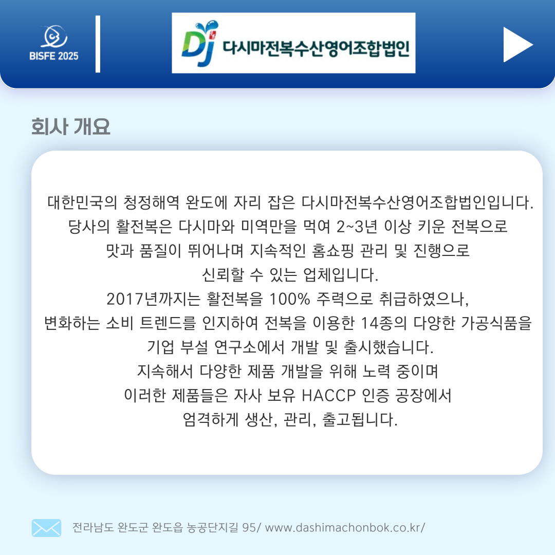 2025 참가업체 다시마전복수산영어조합법인 페이지 정보 본문 2025 부산국제수산EXPO 참가업체 다시마전복수산영어조합법인 입니다. 목록 이전글(주)목포센터 25.11.05 다음글청정남해 25.11.05