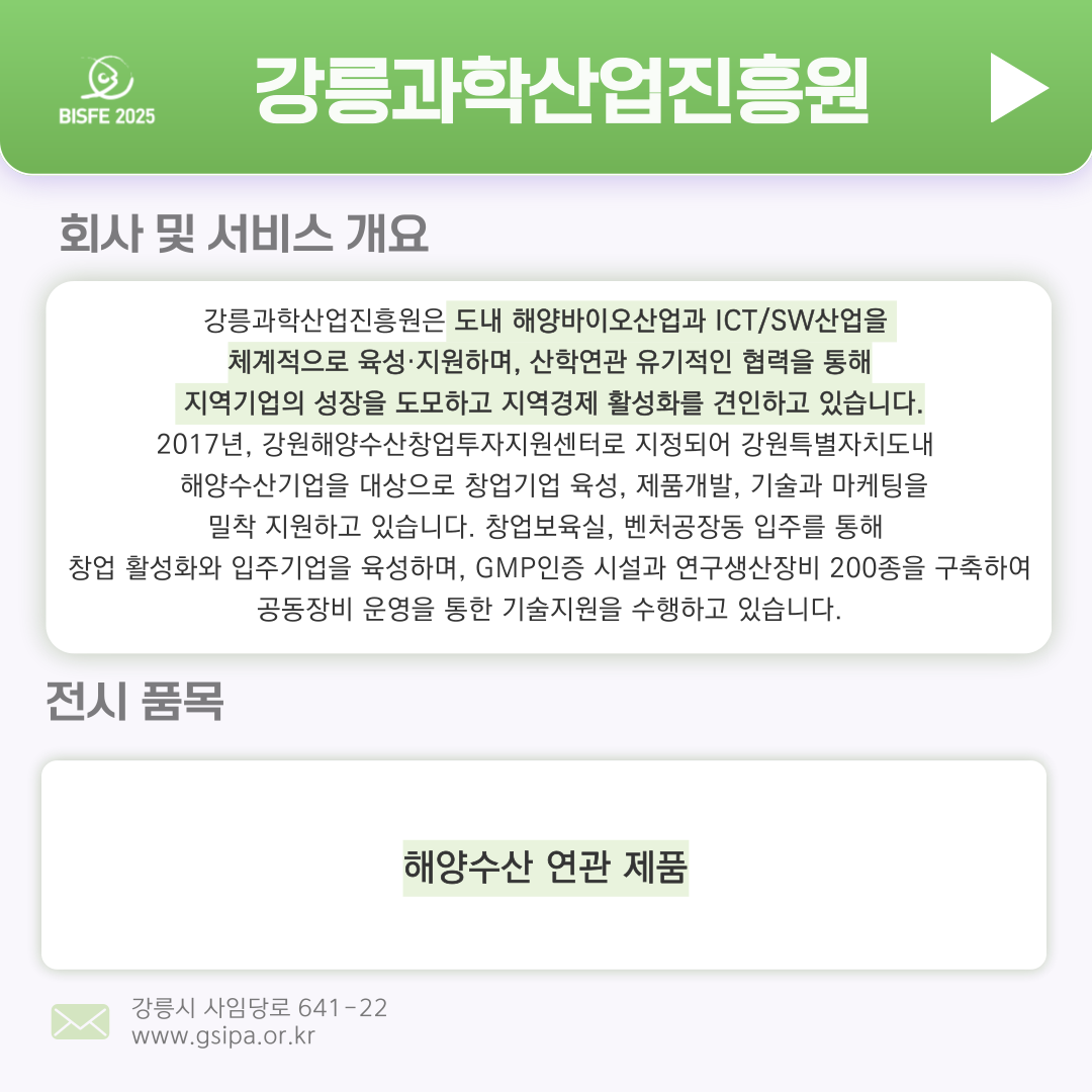 2025 참가업체 강릉과학산업진흥원 페이지 정보 본문 2025 부산국제수산EXPO 참가업체 강릉과학산업진흥원 입니다. 목록 이전글사단법인 부산수산정책포럼 25.11.05 다음글환동해산업연구원 25.11.05